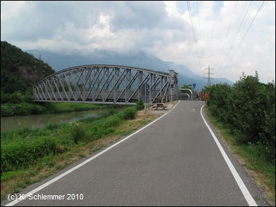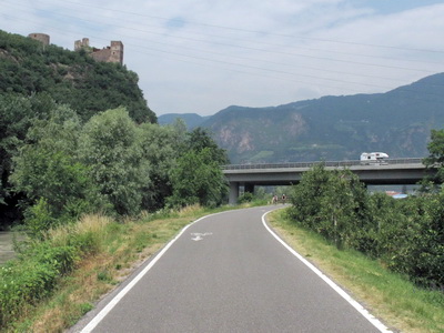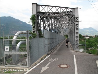 Wenn man aus nördlicher Richtung an der Eisack entlang nach Bozen fährt, ist der Radweg nach Eppan bereits ausgeschildert. Man fährt am Bahnhof Bozen vorbei und folgt dem Fluss abwärts bis zur alten Eisenbahnbrücke über die Talfer.