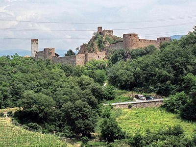 In einer Kurve steigt die Strecke an, der Blick zurück fällt auf das Schloss Sigmundskron.