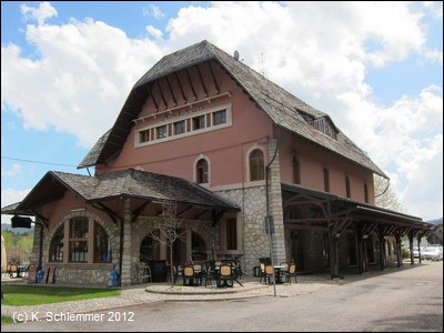 Links das Bahnhofsgebäude und rechts der Straße die Trattoria ai Granatieri. Das alte Bahnhofshäuschen wurde schön restauriert und wird privat genutzt.