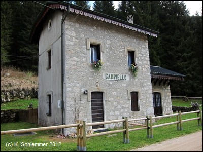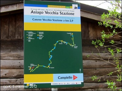 Der Radweg auf der Bahntrasse zwischen Asiago und Campiello (13 km) bietet einige Besonderheiten. Die stillgelegte Bahnstrecke verband Asiago mit Piovene Rocchette. Wegen der Höhendifferenz kam zwischen Cogollo und Campiello nur eine Zahnradunterstützung in Frage. Dieses steile Teilstück der ehemaligen Bahnstrecke ist leider nicht ausgebaut, aber dennoch teilweise befahrbar oder begehbar. Zwischen Cogollo und Piovene Rocchette musste die Bahn den Astico Fluss überqueren, ein mächtiges Stahlviadukt überspannte die Schlucht. Dieses Meisterwerk der Ingenieurskunst wurde leider zerstört, der nachfolgende Tunnel gesperrt. Dem Radler bleibt zum Glück die Strecke Asiago - Campiello, eine abwechslungsreiche Strecke mit zwei Tunneln in der eigenwilligen Landschaft in rund 1000 m über dem Meer.