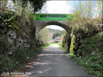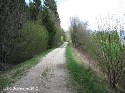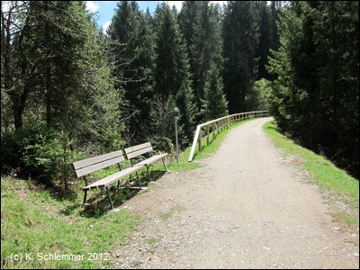 Die offizielle Strecke endet hier (Blick zurück). Aber der Waldweg auf der Trasse führt weiter talwärts.