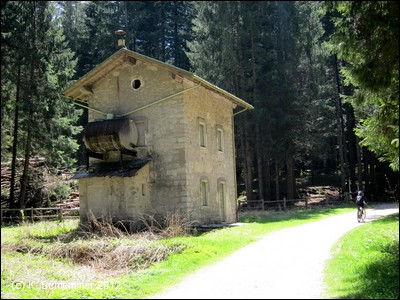 Vorbei am Friedhof von Campiello, der an die Gefallenen längst vergangener Kriegszeiten erinnert. Die Strecke wird steiler und sehr holprig, mit Steinen und Schotter. Ein verfalles Häuschen steht am Streckenrand.