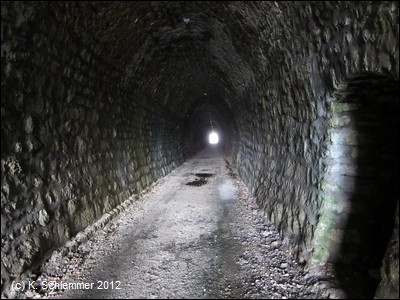 Vorsicht! Keine Beleuchtung. Blick zurück auf das Westportal des Tunnels.
