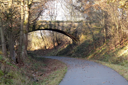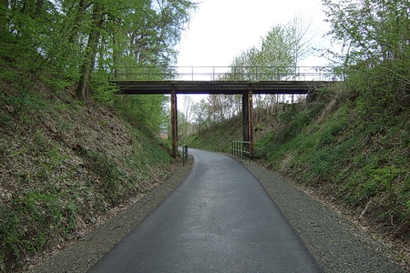 Zeitweise fuhren hier wohl noch Dampfloks? Zuerst geht es unter dem Durchlass hindurch, dann hinauf auf die asphaltierte Trasse.