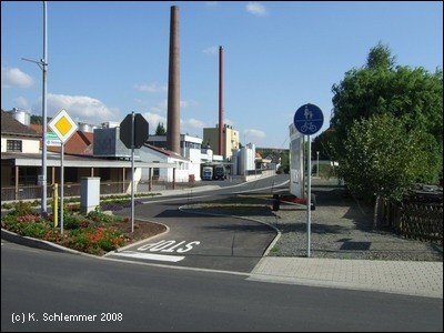 Der Radweg nähert sich dem Haltepunkt Zella. Die alten Silos und Verladeeinrichtung stehen noch neben der Trasse (Blick zurück), ein Bahnhofsgebäude gab es nicht, nur eine Bahnhofsgaststätte 100 m weiter südlich. Eine Bedarfsampel regelt die gefährliche Kreuzung mit der Bundesstraße 254.