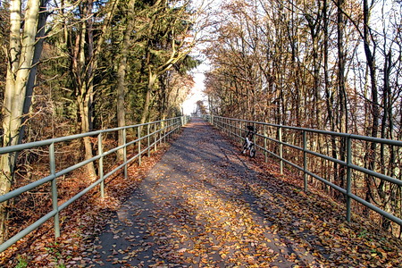 In einer langen Schleife geht es bergauf, ein Brücke überspannt den Radweg. An Geländern wurde hier nicht gespart.