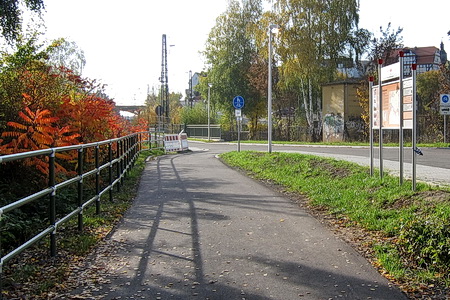 Vor dem Bahnhofsgelände Neukirchen beginnt die 700 m kurze Umfahrung auf einer Fahrradstraße. Vorsicht, motorisierter Verkehr! Der Bahnhof Neukirchen und das Umfeld sind Privatbesitz.