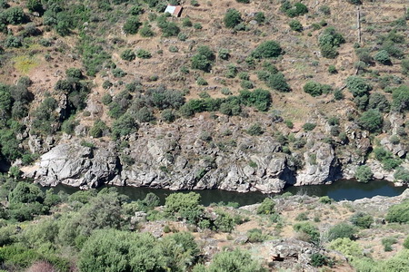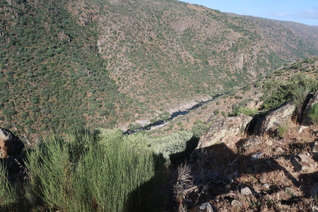 Eine felsige Landschaft umgibt uns, tief unten verläuft nun der Río Águeda, in Flussmitte ist die Grenze zu Portugal.