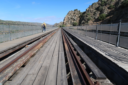 Die Grenzbrücke Puente Internacional der ehemaligen Bahnlinie La Fregeneda - Barca d'Alva an der Mündung des Río Águeda in den Duero/Douro. Die Mitte der Brücke ist die Grenze zwischen Spanien und Portugal. Hier ist auch der Zielpunkt der Wanderung auf dem Camino de Hierro.