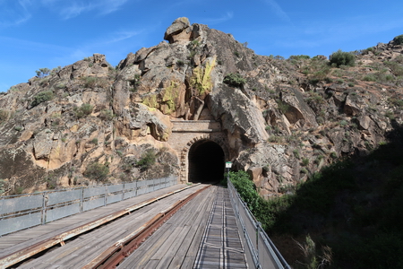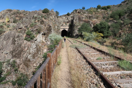 Er ist 1593 m lang! Damit ist er etwa 60 m länger als der längste Bahnradwegetunnel in Deutschland (Küllstedter Tunnel, Thüringen, 1530 m, Kanonenbahn-Radweg ). Man sieht nur den winzigen Lichtpunkt des Portals am anderen Ende, sonst ist es sehr dunkel! Gut dass wir die Lampen haben. Kilometer 63 befindet sich im Tunnel. Die Kilometrierung beginnt in La Fuente de San Esteban-Boadilla (Kilometer Null), Bhf. Fregeneda Kilometer 61,021. Internationale Brücke km 77,565. Genau 16.54 Kilometer ist der Wanderweg lang, (ohne die Umgehung von Tunnel 3, der im Mai 2023 noch zum Schutz der der Fledermäuse gesperrt war).