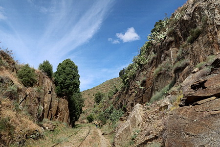 Vorbei an einer Viehweide und durch einen tiefen Felseinschnitt folgt man der Trasse, die hier eng am Steilhang verläuft und durch ein Geländer gesichert ist. Tief unten im Tal hat sich der Grenzfluss Río Àgueda sein Bett in die Felsen gegraben.
