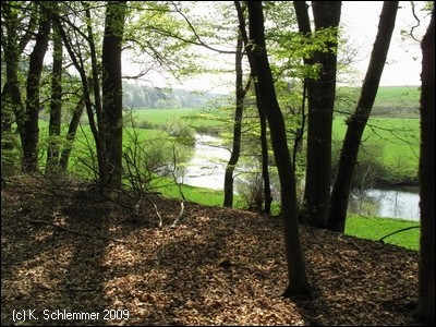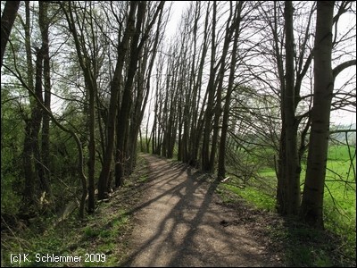 Feuchtbiotop im Naturschutzgebiet Holzape. Noch ein Stück entlang des Flusses, dann biegt der Radweg wieder links ab auf die Bahntrasse.