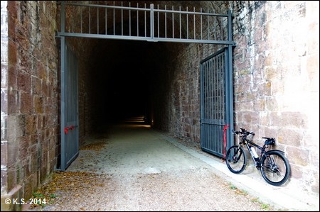 Wir sind am Abzweig zum Deiseler Tunnel angekommen. Nur eine Infotafel steht hier, ein Wegweiser fehlte 2014 noch. Ein kurzes Stück links ab, dann steht man vor dem Nordportal des ältesten Eisenbahntunnels von Hessen.