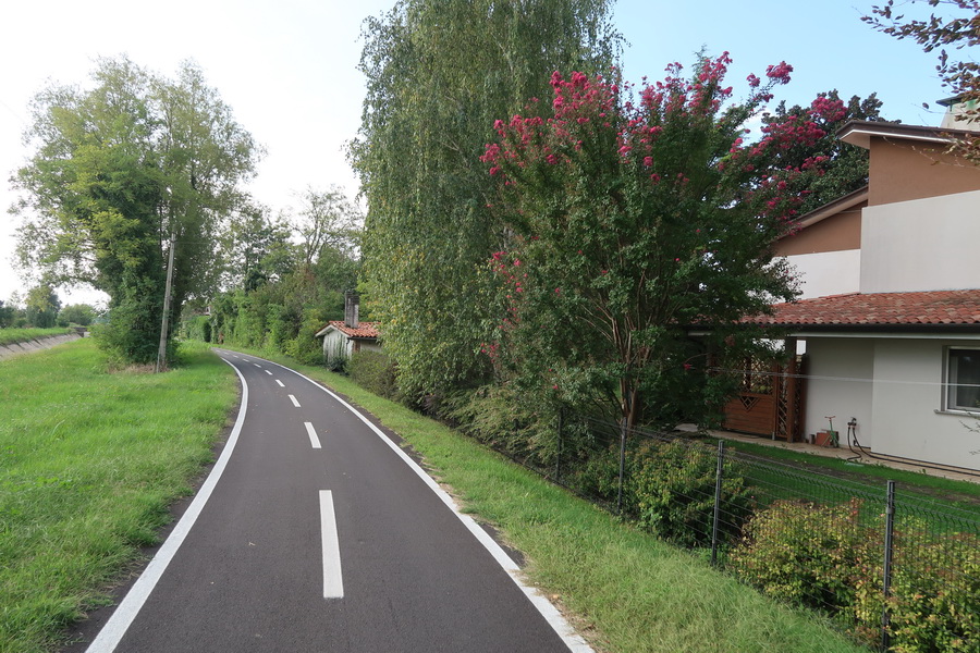 Zwar an allen Querwegen "Stop" für die Radler, aber immerhin ein Radweg. Auch am Fluss Terzo (Fiume Terzo) ist der Radweg auch fertig. Vorsicht, kein Geländer zum Fluss!