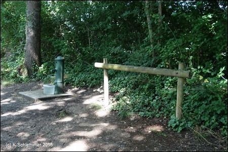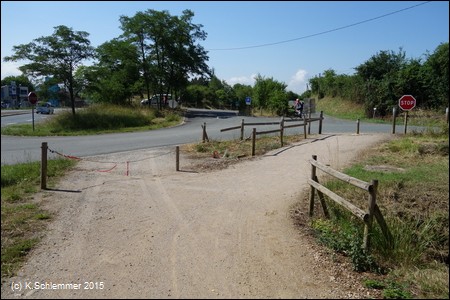 An den Straßenquerungen die üblichen Pfostensperren..... hier auch mit schlecht sichtbarer Sperrkette (re. Bild)!