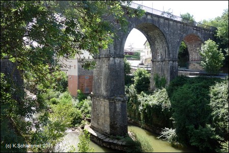 Auf einer alten Steinbrücke überquert der Radweg den Fluss Dadou, ....