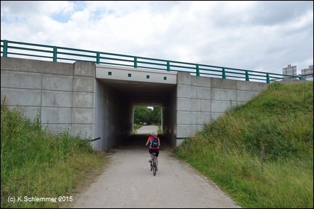 Unter einer massiven Brücke durch und ohne Hindernisse über eine Straßenkreuzung.