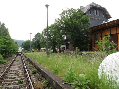 Die Fahrt führt durch eine einsame Waldlandschaft abseits des motorisierten Verkehrs. Von der hoch am Hang verlaufenden Bahnstrecke aus hat man stellenweise einen atemberaubenden Blick weit hinab ins Saaletal und den Beginn des Aufstaus der Talsperre Hohenwarte. Der Stopp an der Ziemestalbrücke ist ein Muss. An dem eigenwilligen Bauwerk wird deutlich, was die Ingenieurskunst vergangener Zeiten zustande gebracht hat. Zwischen 1893 und 1895 entstand das 115 m lange und 35 m hohe Viadukt aus vernieteten Stahlträgern. 10 Pfeiler tragen die Konstruktion, die das Tal in einer langegezogenen Kurve überbrückt. Von der Ferne aus wirkt die filigrane Konstruktion wie aus Streichhölzern erbaut. Der Blick auf die Burgruine Wysburg aus dem 11. Jahrhundert war vom Viadukt aus 2012 leider wegen des starken Bewuchses nicht möglich.