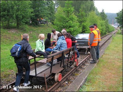 Eine Fahrt mit der Fahrrad-Draisine auf der Strecke der Thüringer Oberlandbahn ist ein besonderes Vergnügen. Bisher besteht die Möglichkeit zu Fahrten an festgelegten Terminen, besonders während der Thüringer Sommerferien (Info auf der Webseite des Thüringer Oberlandbahn e.V.) Außerhalb dieser Termine kann man auch eine Draisine mieten (max. 12 Personen), was natürlich nur für Gruppenausflüge interessant ist (Preis 2012 : pauschal 250.-, Informationen auf der Webseite des Vereins). Es werden 3 Streckenabschnitte angeboten, am interessantesten erscheint uns die Strecke Lückenmühle - Ziegenrück, da sie durch 4 Tunnel und über die mächtige Ziemestalbrücke führt. Die Draisine wartet am Ausgangspunkt Lückenmühle, man fährt mit fachkundiger Begleitung fast nur abwärts nach Ziegenrück. Für die Hinfahrt zum Ausgangspunkt ist ein Taxi/Fahrdienst erforderlich. (Kosten 2012 für 7 Personen ca. 20 €). Für die rund 11 km Fahrt mit Zwischenstopps sollte man 1,5-2 Stunden einplanen.