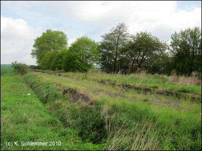 Richtung Wulften ist der Radweg auf der Bahntrasse mit Verbundpflaster befestigt. Auf der schnurgeraden Trasse (re. Blick zurück Richtung Strohkrug). In dem offenem Gelände kann einem der Gegenwind zu schaffen machen.
