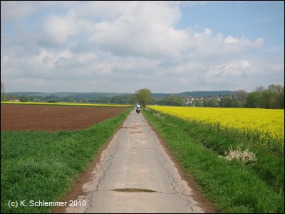 Nach Obernfeld wird der Weg schlechter, nach einem Regenguss geht´s durch die Pfützen. Über eine kleine Brücke, dann erreicht man Rollshausen.