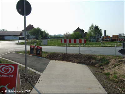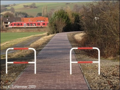 Beginn des Radwegs auf der Trasse an der B 27 in Gieboldehausen. Die üblichen Sperren, viel zu nahe an der Straße, eine Verkehrsinsel soll das Überqueren der gefährlichen Bundesstraße erleichtern.