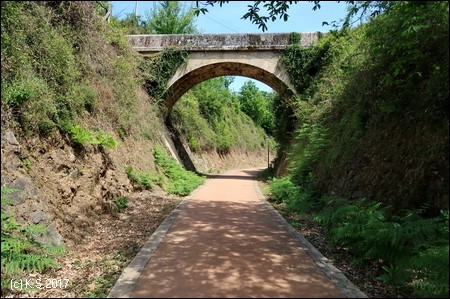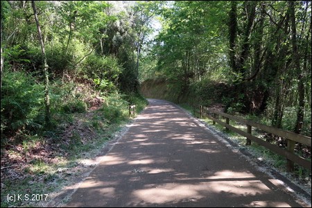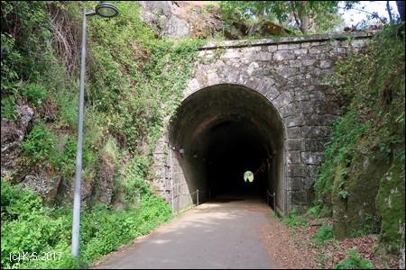 Am Hang entlang durch den Grüngürtel geht es mit moderater Steigung von ca. 3% bergauf, der Radweg knickt nun Richtung Osten ab. Schon ist das Westportal des einzigen Tunnels der ehemaligen Bahnlinie erreicht.