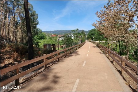 An der nächsten großen Brücke (Ponte do Barreirinho) beginnt wieder der Fahrbahnausbau. Die Brücke mit zwei Natursteinpfeilern und einem Träger aus Beton hat ein neues Geländer bekommen. Die rote Fahrbahn sieht sauber und gepflegt aus. Leider behindern zwei Pfostensperren in der Fahrbahn die Radler.