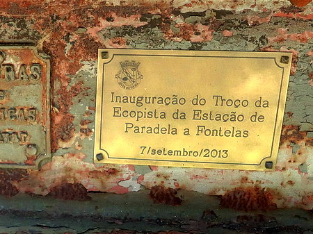 Das Bahnhofsgebäude wurde hübsch restauriert, das Fragment einer Eisenbrücke erinnert an die Eröffnung des letzten Teilstücks der Ecopista zwischen Paradela und Fontelas (2013).