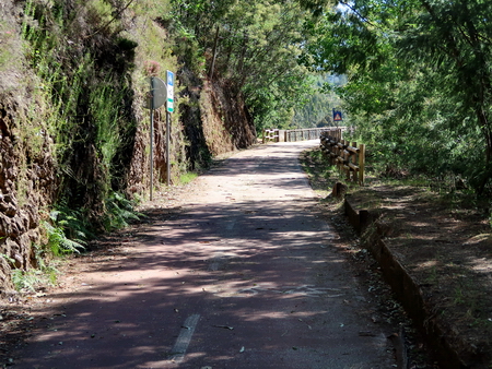 Der Radweg ist auch nach der Straßenüberquerung grün asphaltiert, durch den 25 m kurzen Tunnel Lamas geht es zügig bergab. Etwa 3,2 Km vom Bahnhof Vouzela entfernt, nahe Termas de Sao Pedro, wechselt der Asphalt auf die Farbe rot.