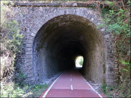 Hinter der Kurve wartet schon der nächste Tunnel, mit 60 m der längste dieses Radwegs. Die Trasse hat nun schon merklich an Höhe gewonnen und führt durch eine Waldlandschaft, geprägt von Eukalyptusbäumen.