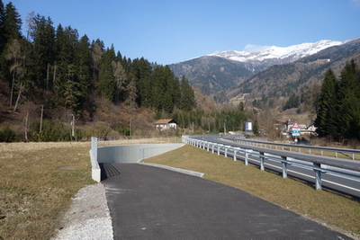 In Mezzaselva wechselt der Radweg unter der Autobahn durch auf die andere Talseite. ZUnächst führt der radweg an der Straße entlang, dann führt eine Brücke über die Staatsstraße.