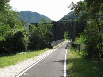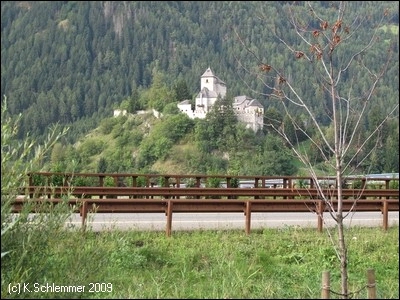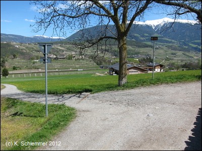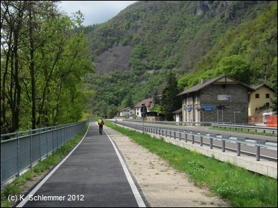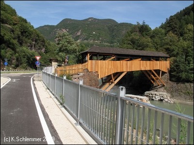 Hier zweigt der Radweg nach Bruneck ins Pustertall entlang des Rienzaflusses ab (kräftig bergauf!). Die Bahnstrecke ins Pustertal überquert das Tal auf einer Eisenbrücke.