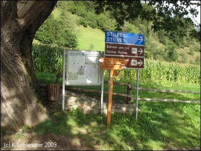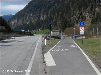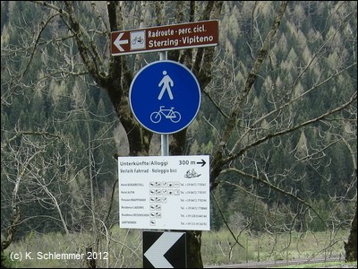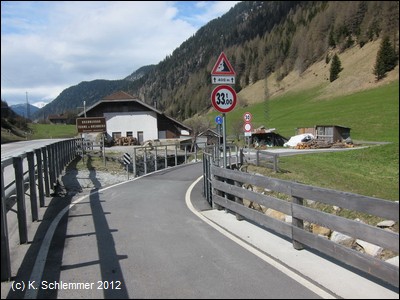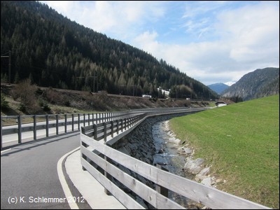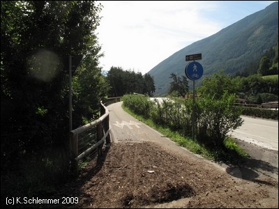 Aus dem Pflerschtal kommend zweigt der Radweg vor dem Bahnhof links ab durch Gossensass. Man kann aber genauso gut geradeaus fahren und erreicht dann wieder den Radweg am südlichen Ortsende.