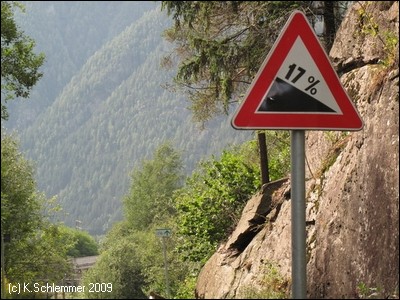 Dann geht es kräftig bergab ins Tal (13% Gefälle). Es folgen ein paar Serpentinen.