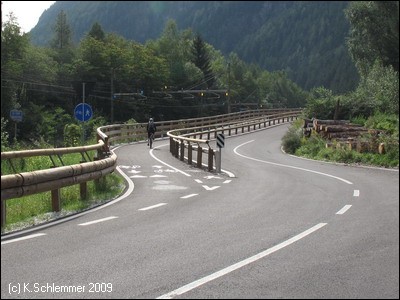 Der Abschnitt von Gossensass nach Sterzing (6,5 km) ist leider nicht so gut gelungen. Nach Überquerung der Brenner-Staatsstraße führt ein neuer, asphaltierter Radweg über Oberried und Unterried zum alten Zoll. Ein steiles Auf und Ab endet schließlich doch auf der Brennerstraße, etwa 1,5 km bis Sterzing muss man gefährliche Straße benutzen. Es wundert nicht, dass einige Radler gleich auf der Straße fahren.