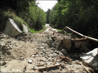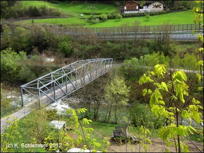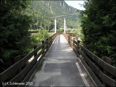 Dann ist man wieder auf der "alten" Strecke" weiter am Fluss entlang. Ein kurzes Stück weiter südlich, bei einer kleinen Brücke, erkennt man auf der linken Seite in der Ferne durch einen Einschnitt gerade noch einige schroffe Berge: die Gipfel von Wasserkofel, Torkofel und Furchetta der Geislerspitzen (Danke an Herrn Dr. Schürenberg für die Info!)
