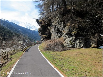 Dann biegt der Radweg wieder links ab und unterquert die Bahnstrecke. In flotter Fahrt bergab erreicht man Gossensass.