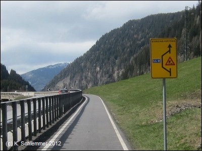 Auch zwischen Gossensass und Sterzing hat sich für die Radler etwas verändert: Ein neues Stück Radweg entlang der linken Eisackseite führt ohne den lästigen Autoverkehr ins Tal. Die Streckenführung ist nicht ideal, denn sie beinhaltet besonders von der Talseite aus einen kräftigen Anstieg - die Autostraße hat es da einfacher. Im Jahr 2015 wurde entlang der Staatsstraße vom alten Zoll bis in die Stadt Sterzing ein Radweg gebaut. In Sterzing ist der Radweg ausgeschildert. Am Ortsausgang von Gossensass muss zunächst die Brennerstraße überquert werden, was bei der Vielzahl von Autos und vor allem Motorrädern nicht immer gefahrlos möglich ist. Die Brennerautobahn führt auf Stelzen hoch über dem Tal Richtung Süden, wir folgen am linken Ufer dem Eisack talwärts.