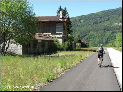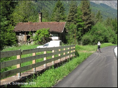 Am südlichen Tunnelausgang steht noch ein altes Bahnhäuschen: Kilometer 233 . Begleitet von Gänsegeschnatter rollen wir talwärts (Blick zurück).