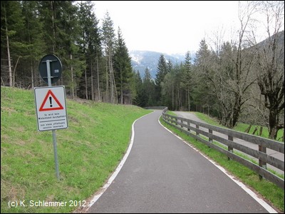 Die Beschilderung führt uns talwärts auf der linken Seite der Staatsstraße. Dann biegt der Radweg nach links ab, überquert einen Bach und folgt der Bahnlinie.