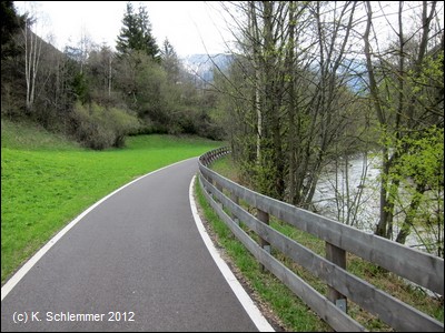 Nach der Brücke über den Eisack schwenkt der Radweg wieder rechts ab - Blick zurück Richtung Brenner.