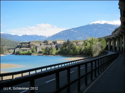 Am Ortsende von Fortezza (Franzensfeste) unterquert der Radweg die Brennerautobahn und führt am Stausee entlang. Auch hier hatten die Unwetter im Herbst 2009 die Strecke verwüstet.