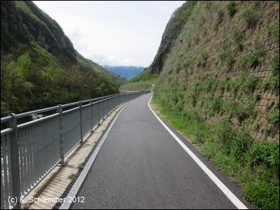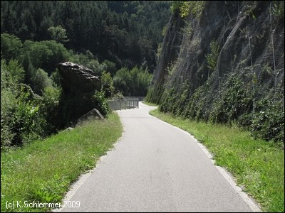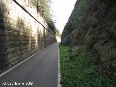 Gut ausgebaut zwischen Felsen und Betonmauer geht es talwärts.