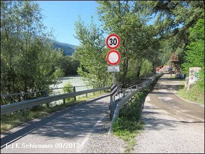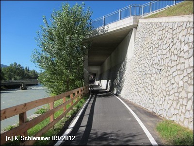 Musste man früher noch durch das Industriegebiet Brixen Süd fahren, so ist im letzten Jahr ein kurzes Stück Radweg neu gebaut worden: man fährt nun direkt am Eisack entlang unter den Brücken hindurch Richtung Bozen.