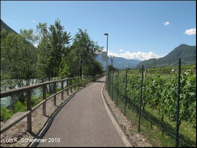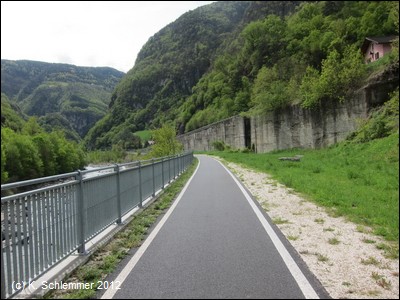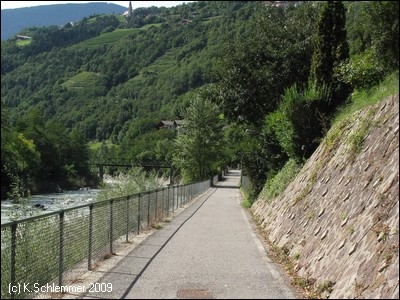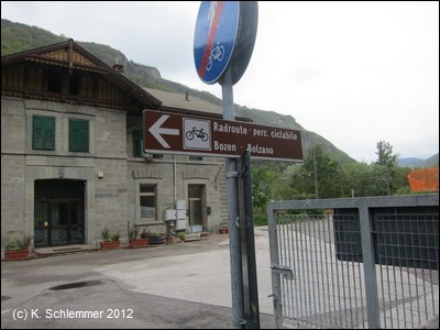 Noch eine kurze "Unebenheit" im Profil vor Waidbruck/Ponte Gardena, dann ist man auf der sehr gut ausgebauten Bahntrasse bis kurz vor Bozen. Der asphaltierte Radweg führt durch etliche Tunnel, im engen Eisacktal immer am Rande des Flusses. Hoch oben, auf Stelzen gebaut, begleitet uns die Brennerautobahn. Ohne Mühe erreicht man auf dem gut ausgebauten Radweg den Bahnhof und die Stadt Bozen.
