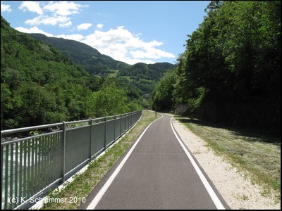 Leider ist die Gesamtstrecke Brenner - Bozen nicht durchgängig asphaltiert, auf die Einzelheiten wird im Bildteil näher eingegangen. Für Skater und Rollstuhlfahrer ist natürlich besonders der untere Abschnitt auf der Bahntrasse zwischen Waidbruck und Kardaun ideal (18 km, bis Bozen 21 km).