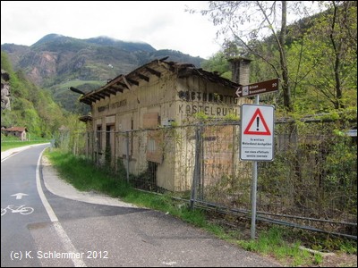 Der alte Bahnhof von Atzwang (Campodazzo) liegt verlassen und vermauert auf der anderen Straßenseite.
