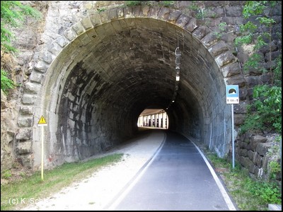 Aber auch sehr kurze Tunnel kommen vor - dieser ist nur 17 m lang. Den Wegweisern folgen, man fährt zum Bahnhof Blumau und dann links ab.