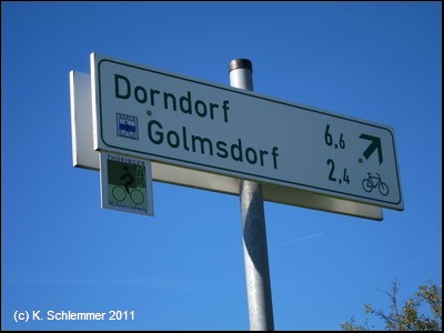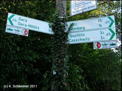 Schon ab Gera ist die Zufahrt beschildert (Richtung Mühltal). D4 Route und derThüringer Städtekette Radweg benutzen die gleiche Strecke bis nach Kursdorf.